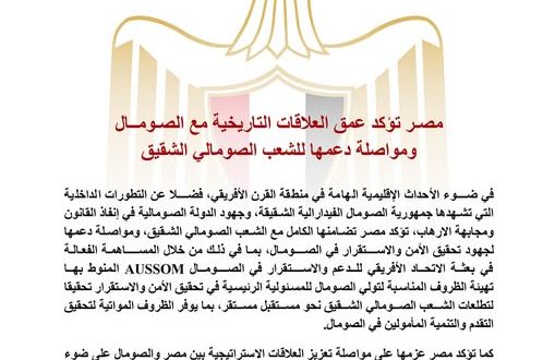 في ضوء الأحداث الإقليمية الهامة في منطقة القرن الأفريقي، فضلا عن التطورات الداخلية التي تشهدها جمهورية الصومال الفيدارالية الشقيقة، وجهود الدولة الصومالية في إنفاذ القانون ومجابهة الارهاب، تؤكد مصر تضامنها الكامل مع الشعب الصومالي الشقيق، ومواصلة دعمها لجهود تحقيق الأمن والاستقرار في الصومال، بما في ذلك من خلال المساهمة الفعالة في بعثة الاتحاد الأفريقي للدعم والاستقرار في الصومال AUSSOM المنوط بها تهيئة الظروف المناسبة لتولي الصومال للمسئولية الرئيسية في تحقيق الأمن والاستقرار تحقيقا لتطلعات الشعب الصومالي الشقيق نحو مستقبل مستقر، بما يوفر الظروف المواتية لتحقيق التقدم والتنمية المأمولين في الصومال.