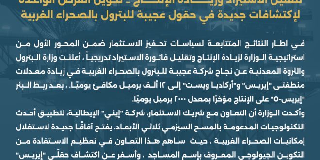 في اطار النتائج المتتابعة لسياسات تحفيز الاستثمار ضمن المحور الأول من استراتيجية الوزارة لزيادة الإنتاج وتقليل فاتورة الاستيراد تدريجياً ، أعلنت وزارة البترول والثروة المعدنية عن نجاح شركة عجيبة للبترول في زيادة معدلات منطقتى “إيريس” و”أركاديا ويست” بالصحراء الغربية إلى 12 ألف برميل مكافئ يوميًا. ، بعد ربط البئر “إيريس-5” على الإنتاج مؤخرًا بمعدل 2000 برميل يوميًا.