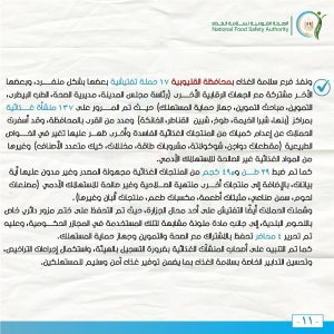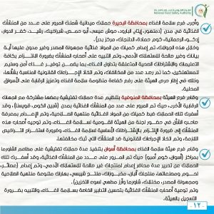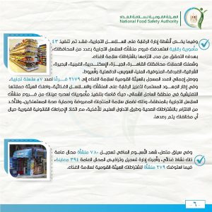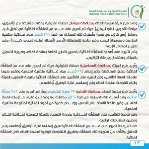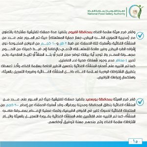 كما تم إعادة المرور على عدد من المنشآت الغذائية سبق إمهالها فترة لتوفيق أوضاعها، وتم التحقق والتأكد من استجابة تلك المنشآت وتطبيق الاشتراطات الواجبة لسلامة الغذاء داخل المنشآت الغذائية.