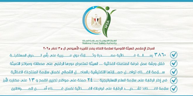 أصدر المركز الإعلامي للهيئة القومية لسلامة الغذاء تقريره الأسبوعي الـ 35 لعام 2025، وذلك عن الفترة من 20 – 26 سبتمبر، والذي تضمن العديد من الأنشطة المختلفة على النحو التالي: