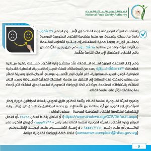 وتهيب الهيئة، برئاسة الدكتور طارق الهوبي، بالسادة المواطنين ضرورة الإبلاغ الفوري عن أية مخالفة قد تمس سلامة الغذاء أو تشكل خطرًا على الصحة العامة، ويمكن تقديم الشكاوى من خلال البوابة الإلكترونية لمنظومة الشكاوى الحكومية الموحدة – مجلس الوزراء .