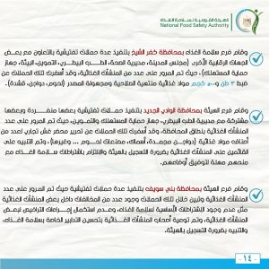 وقام فرع الهيئة بمحافظة بني سويف بتنفيذ عدة حملات تفتيشية حيث تم المرور على عدد من المنشآت الغذائية، وتبين خلال تلك الحملات وجود عدد من المخالفات داخل بعض المنشآت الغذائية مثل عدم وجود الاشتراطات الأساسية لسلامة الغذاء، وعدم استكمال إجراءات التراخيص لبعض المنشآت الغذائية، وتم توعية أصحاب المنشآت الغذائية بتحسين التدابير الخاصة بسلامة الغذاء، والتنبيه بضرورة التسجيل بالهيئة.