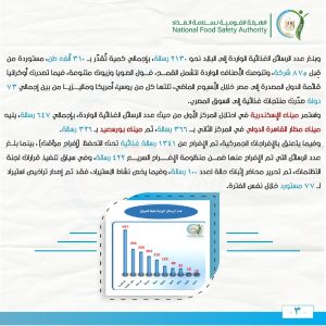 واستمر ميناء الإسكندرية في احتلال المركز الأول من حيث عدد الرسائل الغذائية الواردة، بإجمالي 647 رسالة، يليه ميناء مطار القاهرة الدولي في المركز الثاني بـــ 366 رسالة، ثم ميناء بورسعيد بـ 326 رسالة.