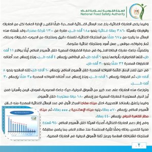 وفيما يخص الصادرات الغذائية، بلغ عدد الرسائل الغذائية المصدرة طبقًا لتقرير الإدارة العامة لكل من الصادرات والواردات بالهيئة 3860 رسالة غذائية بنحو 185 ألف طن، صادرة عن 1300 شركة مصدرة، وقد شملت هذه