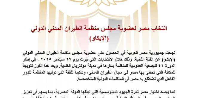 نجحت جمهورية مصر العربية في الحصول على عضوية مجلس منظمة الطيران المدني الدولي (الإيكاو) عن الفئة الثانية، وذلك خلال الانتخابات التي جرت يوم ٢٧ سبتمبر ٢٠٢٥، في إطار الدورة ٤٢ للجمعية العمومية للمنظمة بمقرها في مدينة مونتريال الكندية. ويعد هذا الفوز تتويجا للمكانة التي تحظى بها مصر في مجال الطيران المدني، وتأكيداً للثقة التي توليها المنظمة للدور الفاعل الذي تضطلع به مصر في المنظمات الدولية المتخصصة.