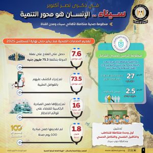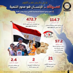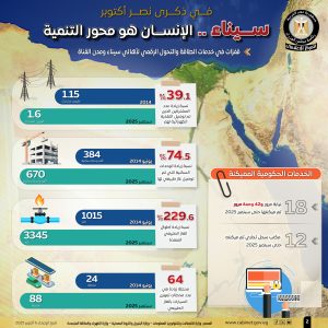 نشر المركز الإعلامي لمجلس الوزراء، عددًا من الإنفوجرافات على منصاته بمواقع التواصل الاجتماعي، تحت عنوان “سيناء.. الإنسان هو محور التنمية”، لتسليط الضوء على الطفرة التنموية والإنجازات في مختلف القطاعات في سيناء، بما ينعكس على تحسين حياة أبنائها، وذلك في ذكرى نصر أكتوبر.