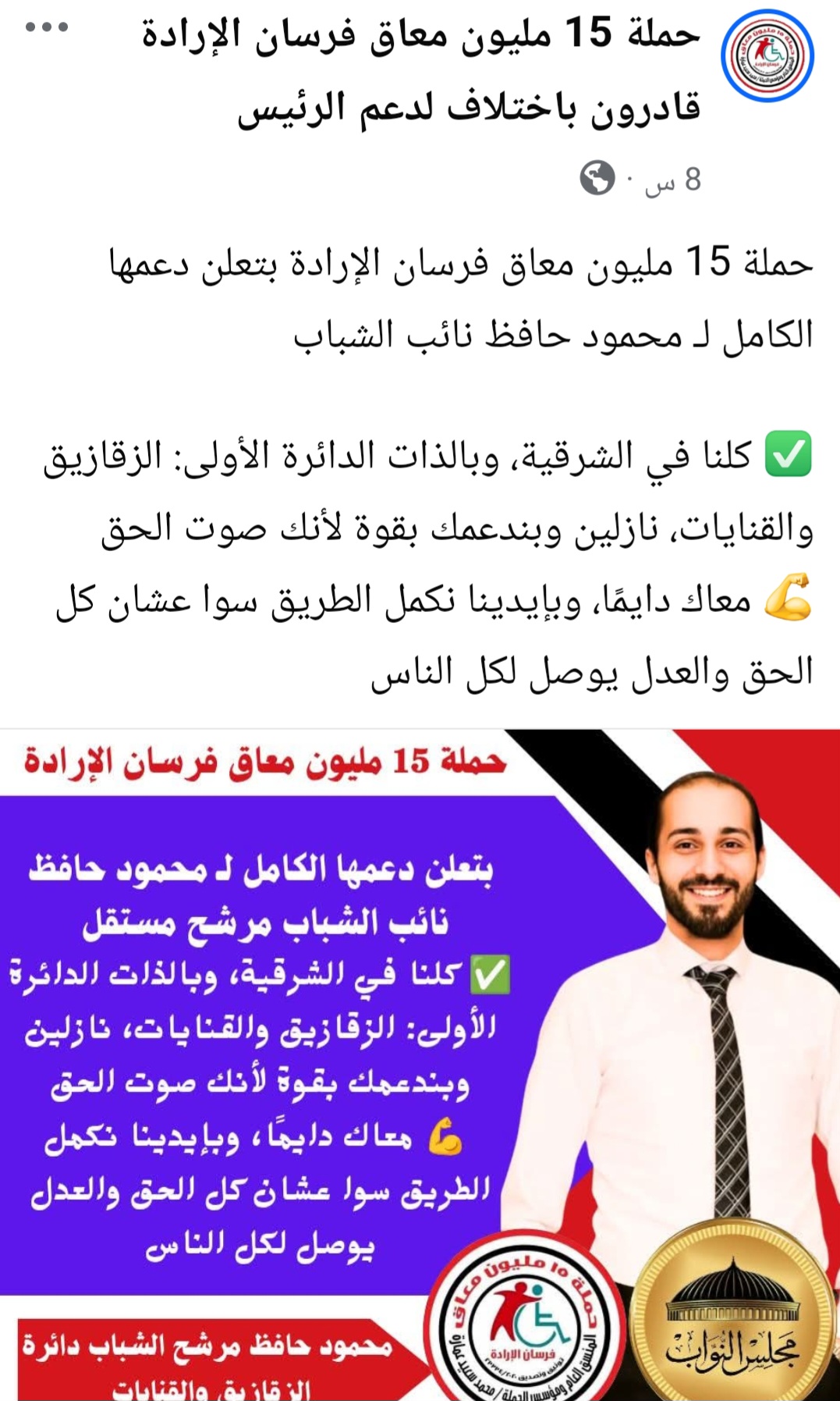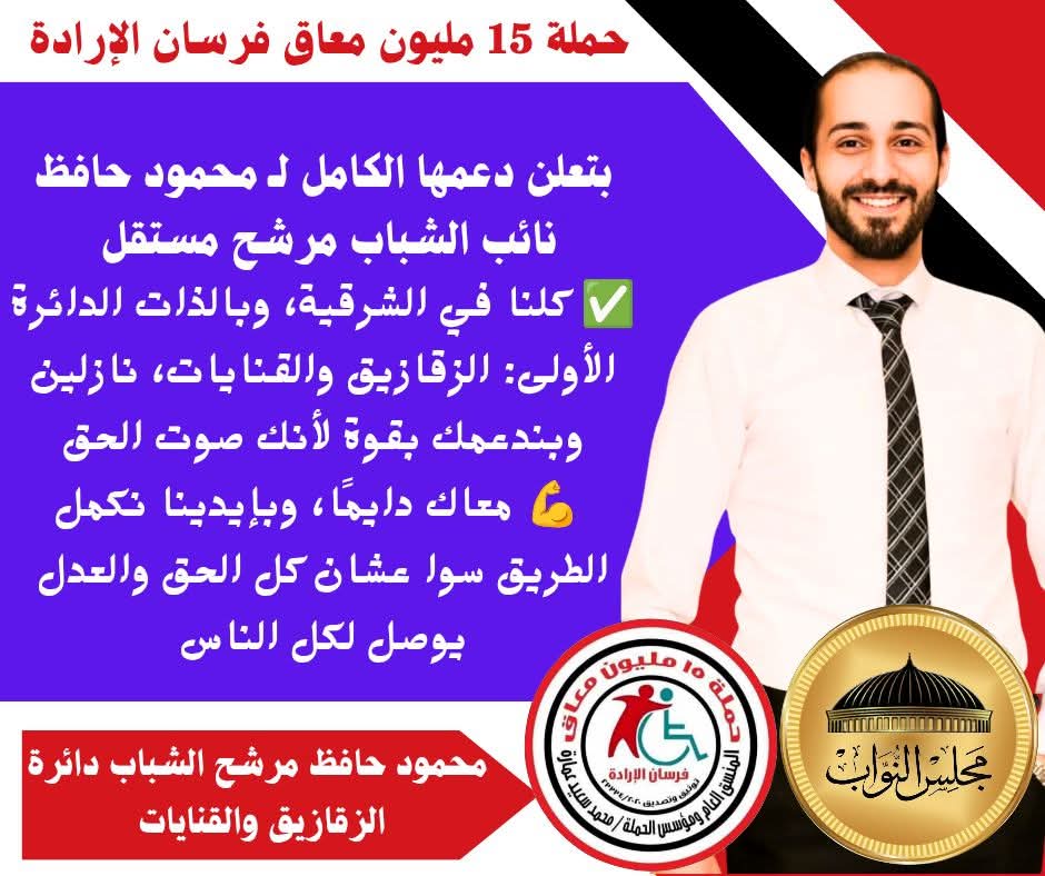 أعلنت حملة ١٥ مليون معاق فرع الشرقية ، تحديدا أبناء الدائرة الأولى مركز ومدينة الزقازيق والقنايات ، كامل الدعم والتأييد لمرشح الشباب محمود حافظ رقم ٢٥ رمز الخاتم .